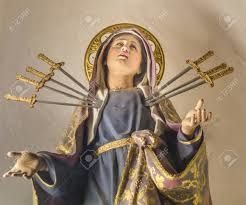 Le thème de la vierge des sept douleurs remonte à la fin du moyen âge et à une spiritualité doloriste portée par l'ordre des Servites de Marie, qui prend de l'importance au cours des XIV et XV siècles, quand de grandes épidemies décimèrent l'europe.